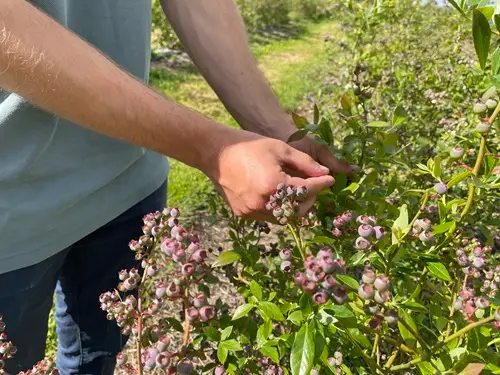 Our journey begins on the farm, where we carefully cultivate our blueberries. This first step is about nurturing the soil and plants to ensure the highest quality fruit.